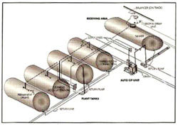 The figure at right depicts a basic arrangement of a latter-day CIP system incorporating supply/return piping for cleaning four in-plant tanks and an individual mobile tanker in a receiving area. Check valves in the system provide continuous movement of flush, wash and rinse solutions from the return pumps back to the recirculating unit. Solution supply to the sprays is controlled by one air-operated valve and a u-bend position on a cleaning hook-up station. Return flow from the tank is accomplished by installing a removeable elbow between the tank outlet valve and a permanently installed return header to the pump. Note that tankers are cleaned with a drop-in spray nozzle supplied by a hose, and the tanker return flow is through a hose to a permanently mount return pipe.