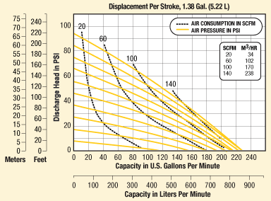 Performance Chart – Metallic Models Note: For E3 pumps fitted with Teflon® diaphragms, reduce water discharge figures by 20%. Suction lift is reduced to 10' (3.05m) dry and 20' (6.10m) wet.