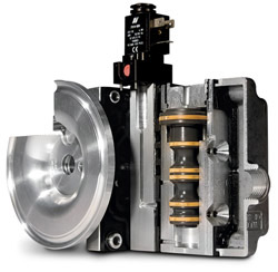 The Accu-Flo pump technology employs a two-position, four-way solenoid valve that has a single operator and spring return. The valve is internally air piloted for longer coil and operator life. Air pressure is utilized to fill air chambers and displace the diaphragms, but electrical impulses dictate stroke rate. When the solenoid is unpowered, the air valve piston is held by a spring to the top of the air valve body. In this position, the air supply is directed to the right side of the pump while the left air chamber is exhausted. When the solenoid is powered by electricity, air pressure is routed to the top of the air valve piston which overcomes the tension of the spring and forces the piston down. In this position, the air valve piston directs the air supply to the left side of the pump and exhausts the right side. By alternately applying and removing electrical power, the Accu-Flo pump reciprocates back and forth similar to standard air-operated pumps.
